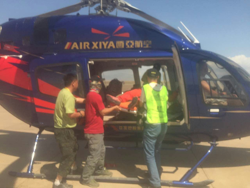 截止6月18日晚,西亞航空環(huán)塔空中救援小組所有成員在和碩環(huán)塔大本營集結(jié)完畢。6月24日,在SS3庫木塔格沙漠特殊賽段,有兩名賽手在沙漠中嚴(yán)重受傷,西亞航空救援隊(duì)接到任務(wù)后,7分鐘趕到沙漠中出事點(diǎn),飛行員馬斌,一機(jī)救出2名傷員,在醫(yī)務(wù)人員不足的情況下,親自抬傷員。8分鐘到鄯善機(jī)場(chǎng),落地后救護(hù)車將傷員拉往醫(yī)院。