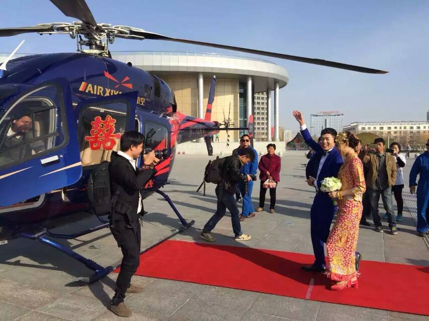 12時許,從美美電影院對面小區走出了一對新人,新娘身著禮服,新郎西裝筆挺,踏著紅地毯,在百余名親朋好友的簇擁下,登上了飛機,大家才知道直升飛機是用來娶親的。直升飛機起飛的同時,婚禮禮賓車隊也出發了,引得不少市民舉起手機拍照,并把圖片發到朋友圈。途中,B-7483直升機在奎屯市上空飛行一周,飛行了40多分鐘。