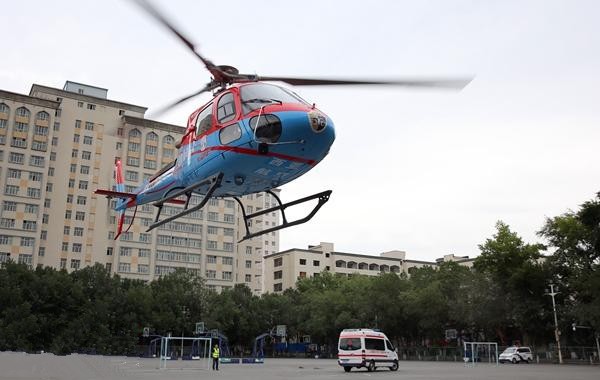 8月21日上午,隨著一陣直升機的轟鳴聲,空客公司交付西亞航空的新疆地區首架H125直升機落在了新疆醫科大學第一附屬醫院籃球場上,一支訓練有素的急救隊伍迅速向直升機靠攏,一位腿腳骨折并失血較多的“病人”從打開的艙門中被救援組織隊員抬下飛機,交給了在降落地點緊急待命的一附院醫護人員,被送往急救中心救治。這是一場由新疆地區首家直升機商務運營企業——西亞直升機航空有限公司與民間救援專業團體——烏魯木齊公羊救援協會,在新疆醫科大學第一附屬醫院協助下聯合舉辦的新疆地區首次空中救援演練活動。